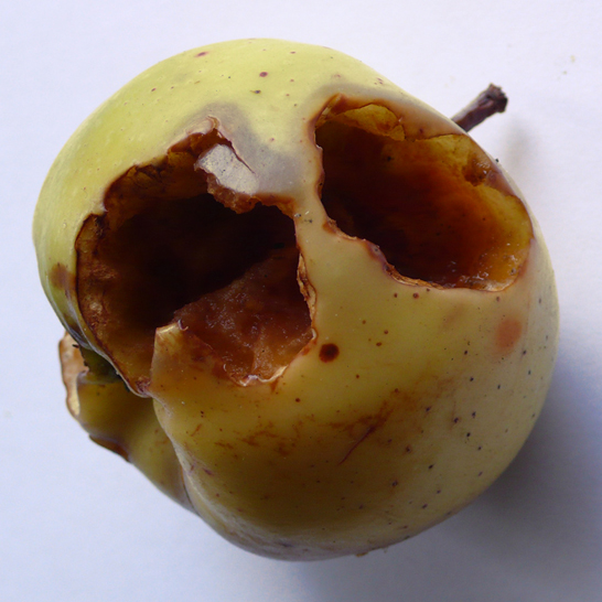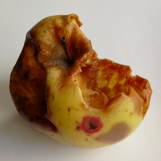 Zwei Fotos aus einer Serie von vergammelten + von Wespen angefressenen Äpfeln in der tollen, non-profit Gartenzeitschrift aus Berlin.