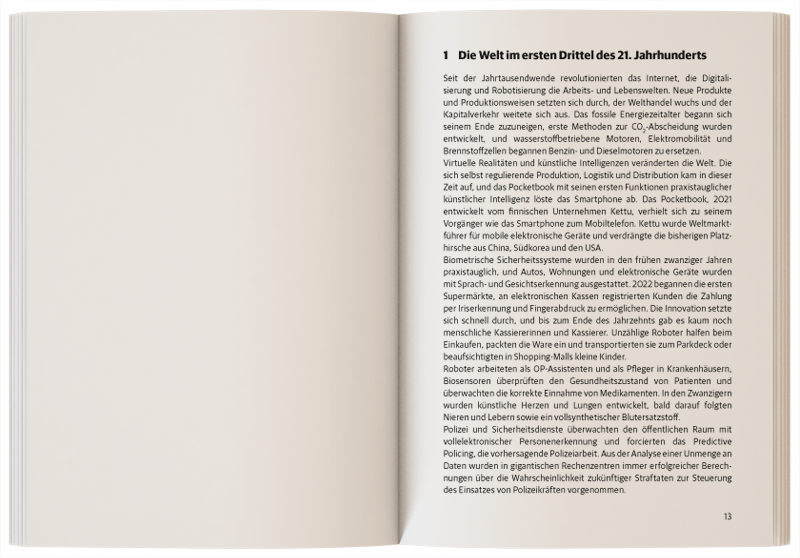 Buchgestaltung (Umschlag & Satz) für ein Buch, welches einen Rückblick aus einer Zukunft, in der das bedingungslose Grundeinkommen alltägliche Selbstverständlichkeit geworden ist, gibt.