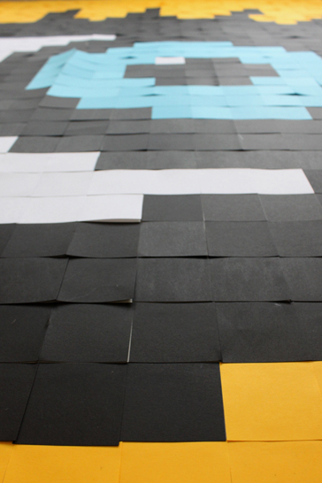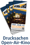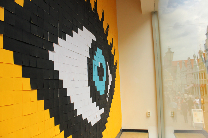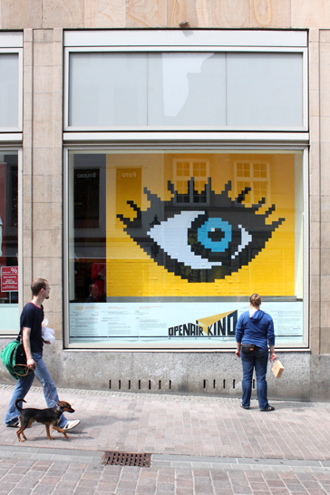 1744 Klebezettel auf einer Fläche von ca. 2,5 x 3 m als Blickfang für die Programmübersicht des Open-Air-Kinos im Zeughaushof in Wismar.